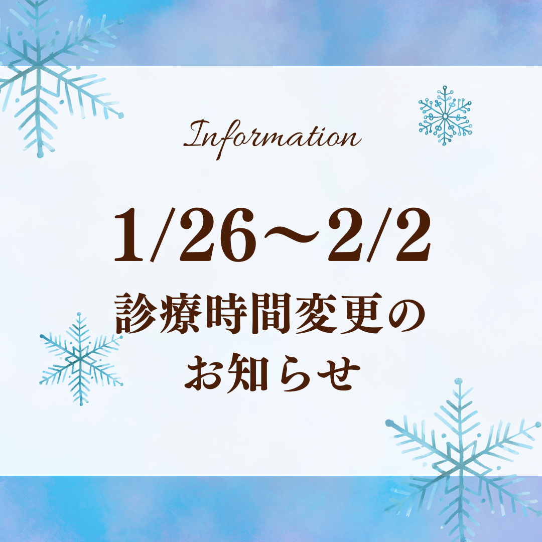 2026年01月26日 | お知らせ平素は格別のお引き立てを賜り厚く御礼申し上げます。 急なことで誠に申し訳ございませんが、諸般の事情により1月26日~2月2日の午後は、17時にて診療終了といたします。 また、現状御予約の方のみの診療とさせていただきます。 なお、状況によっては延長の可能性もございます。 ご迷惑をおかけいたしますが、なにとぞよろしくお願い申し上げます。