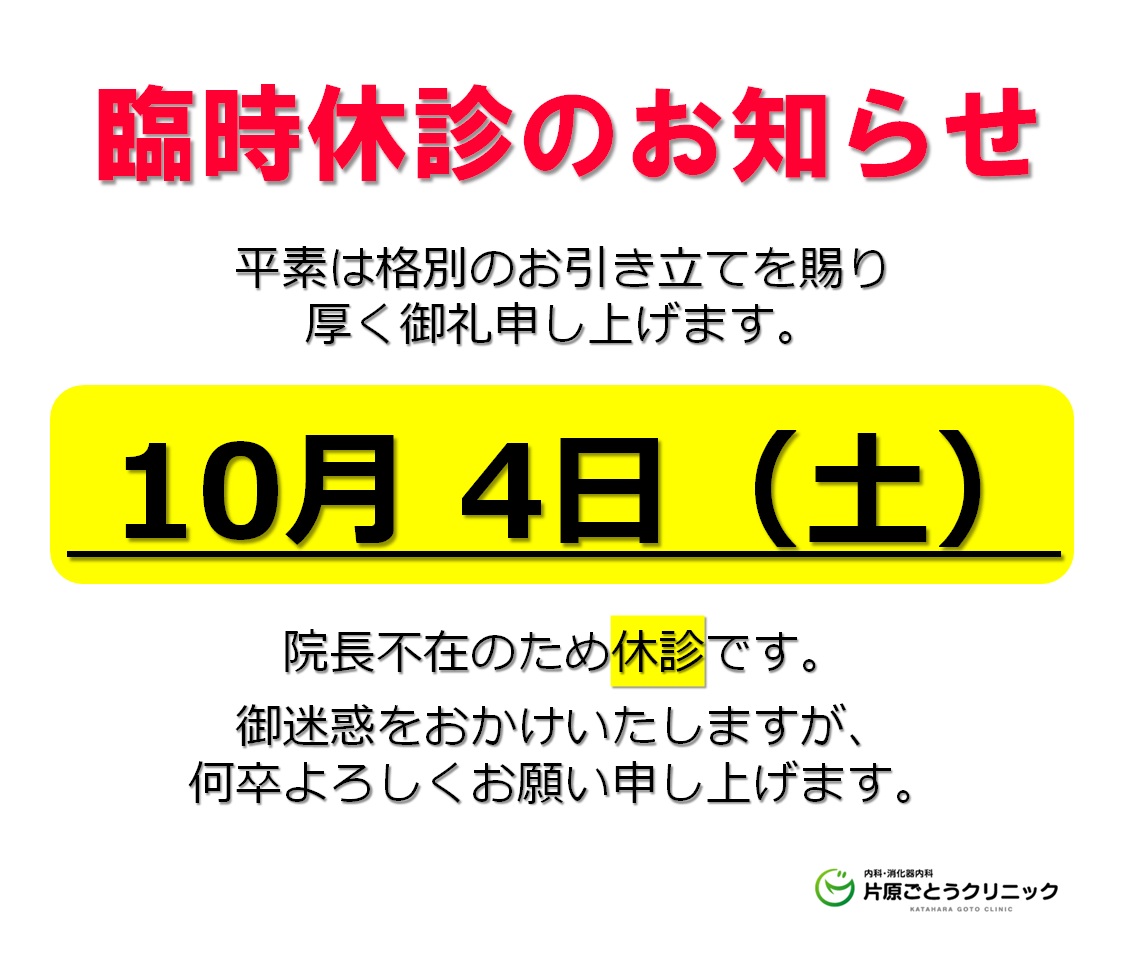 院長不在のため、当院、下記の日程で休診とさせていただきます。